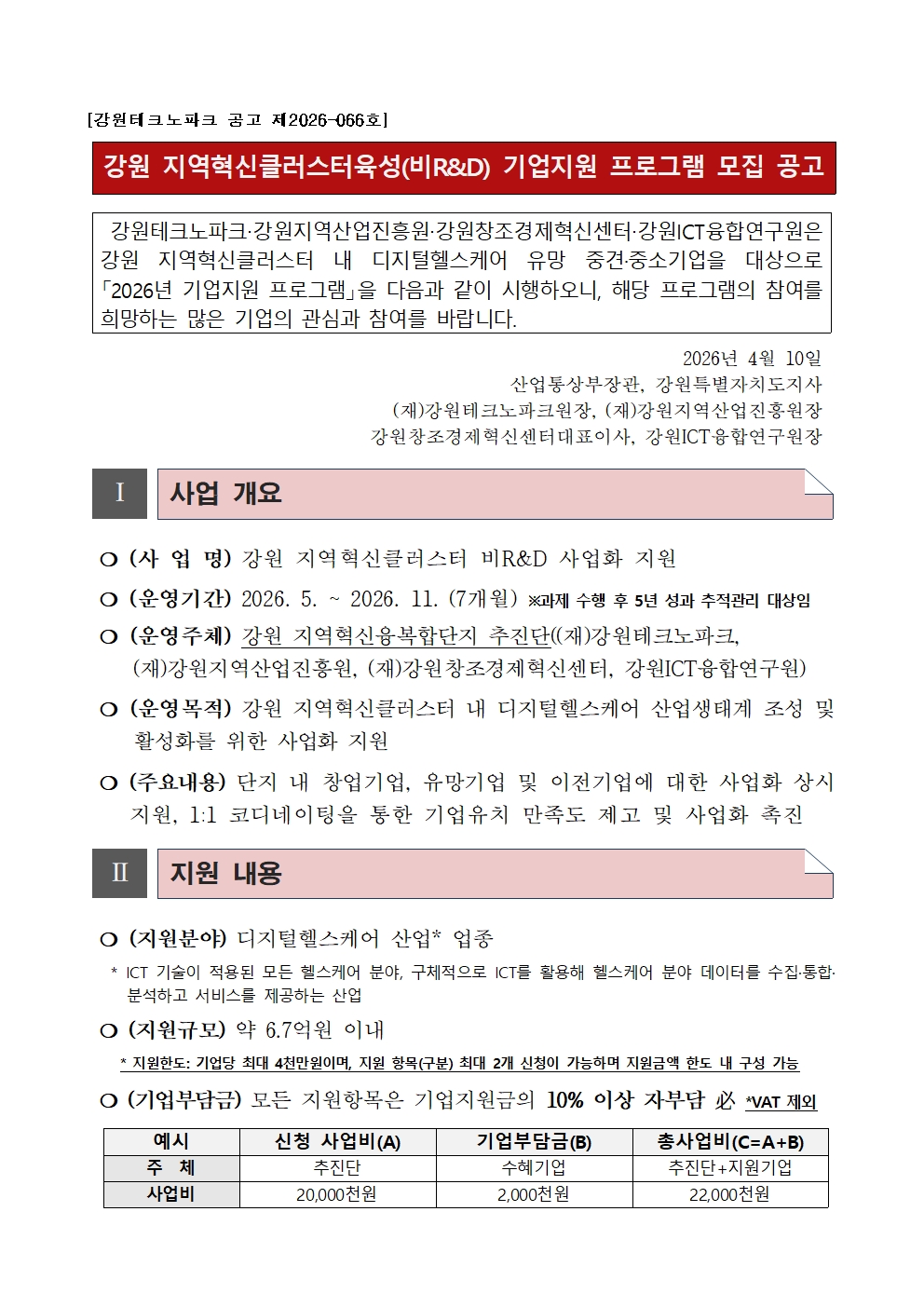 2026년 강원 지역혁신클러스터육성(비R&D) 기업지원 프로그램 모집 공고